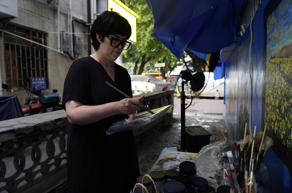 Maria João Príncipe pinta numa viela estreita da estrada Huaguo.