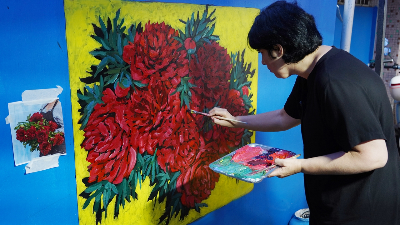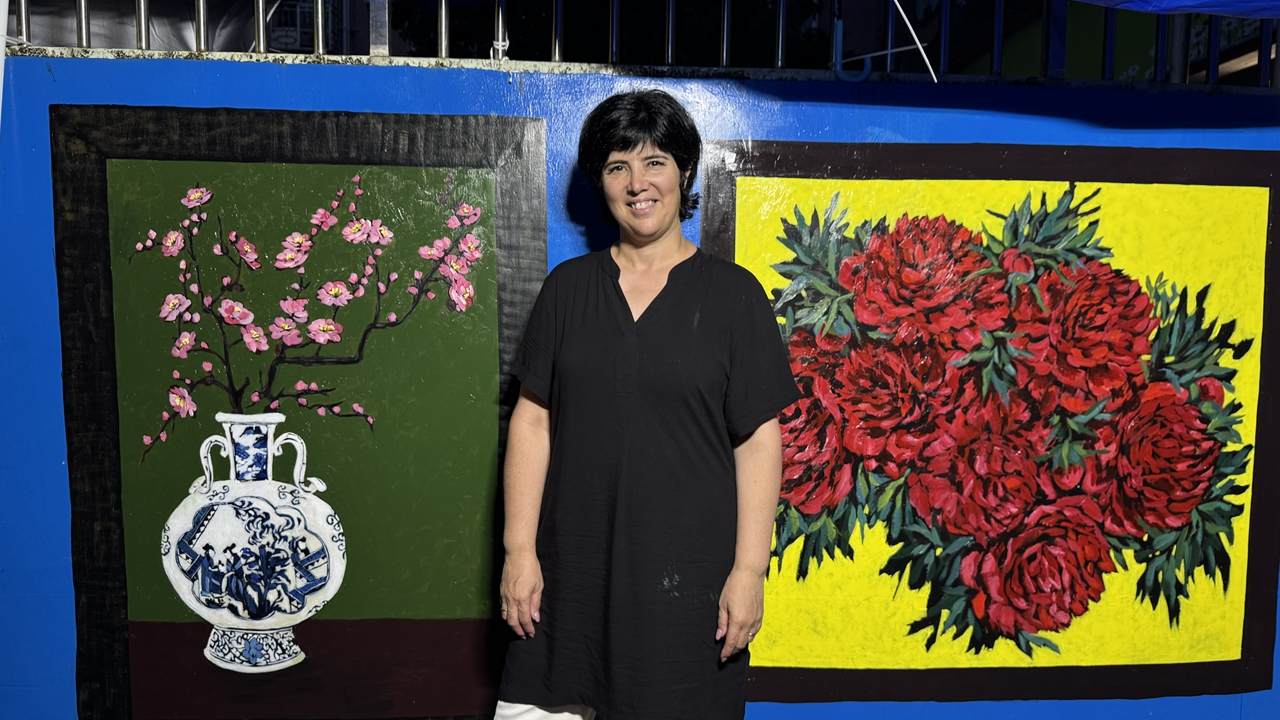 O projeto criativo de Majó estava quase concluído à medida que a terceira semana se aproximava do fim. "Só preciso dar alguns retoques finais ao fundo amarelo das peônias vermelhas vibrantes, seguido por uma moldura marrom-escura para o mural", disse a artista ao Shenzhen Daily no final da tarde de quinta-feira.