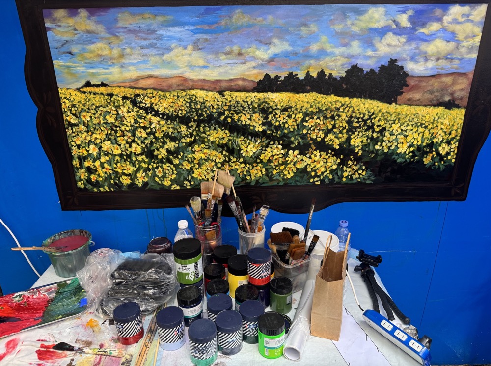 Pincéis e tintas de Maria João Príncipe em frente ao mural.
