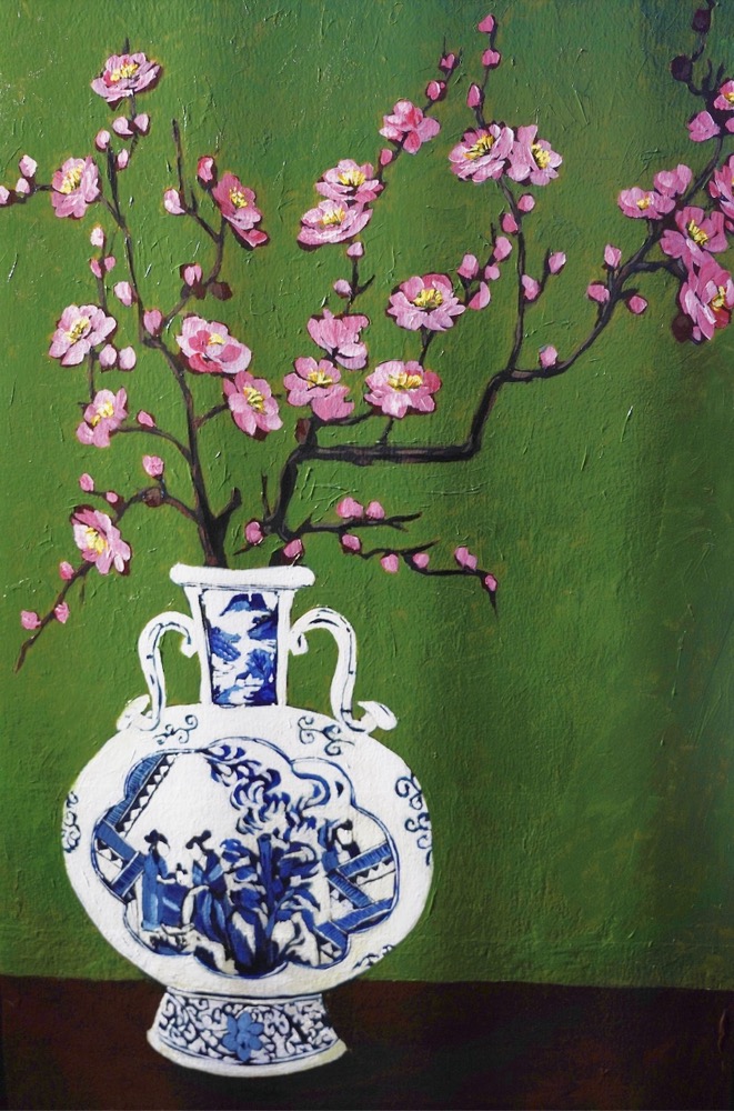 Agora, Majó prefere uma abordagem mais espontânea — ela simplesmente pega o pincel e pinta, refinando as imagens à medida que avança. Ela cria contrastes vibrantes combinando cores mais escuras com outras mais claras, o que distingue claramente cada flor de ameixeira à medida que ela ganha vida.