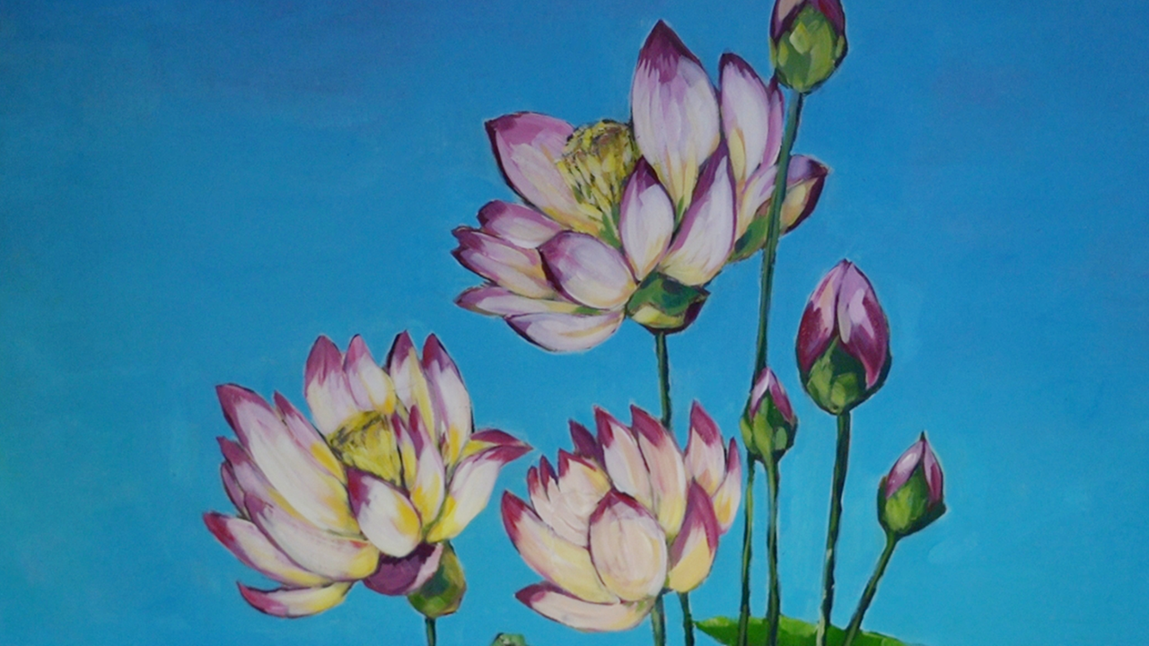 Esta foi a terceira semana que Majó trabalhou no mural, intitulado “As flores que levamos conosco”. O mural consiste em cinco flores chinesas icônicas: a elegante orquídea da primavera, o puro lótus do verão, o nobre crisântemo do outono, a resiliente flor de ameixa do inverno e a majestosa peônia.