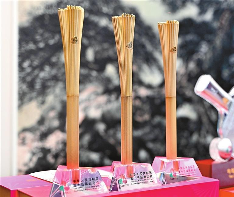 Modelos da tocha dos 15º Jogos Nacionais exibidos ontem na coletiva de imprensa, em Guangzhou. Xinhua