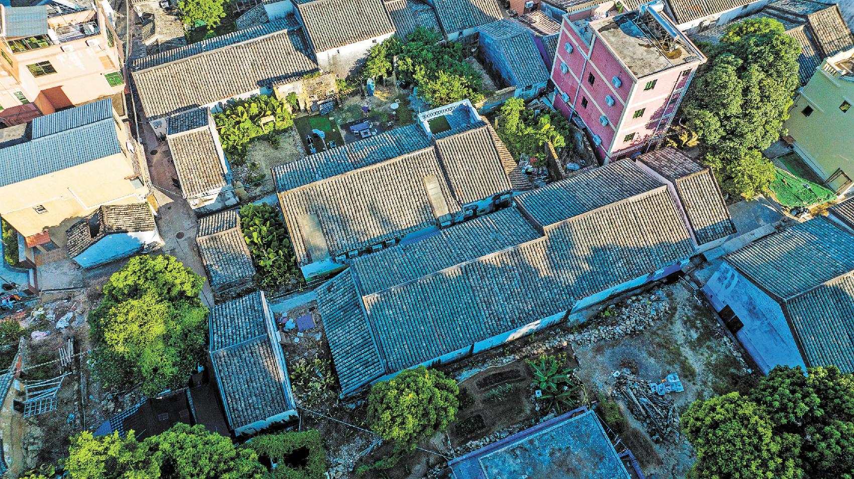 O vilarejo abriga as tradicionais casas populares no estilo Lingnan. As habitações populares, que apresentam paredes brancas e azulejos cinza, resistiram apesar de terem sido submetidas a anos de danos causados pelo vento e pela chuva.
