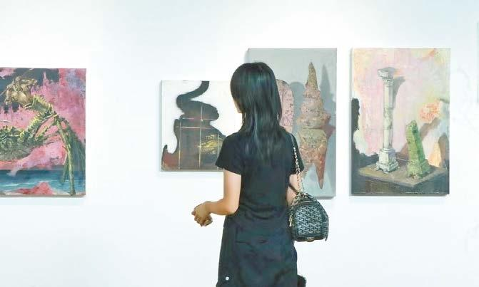 Visitante admira pinturas na exposição. Cortesia dos organizadores