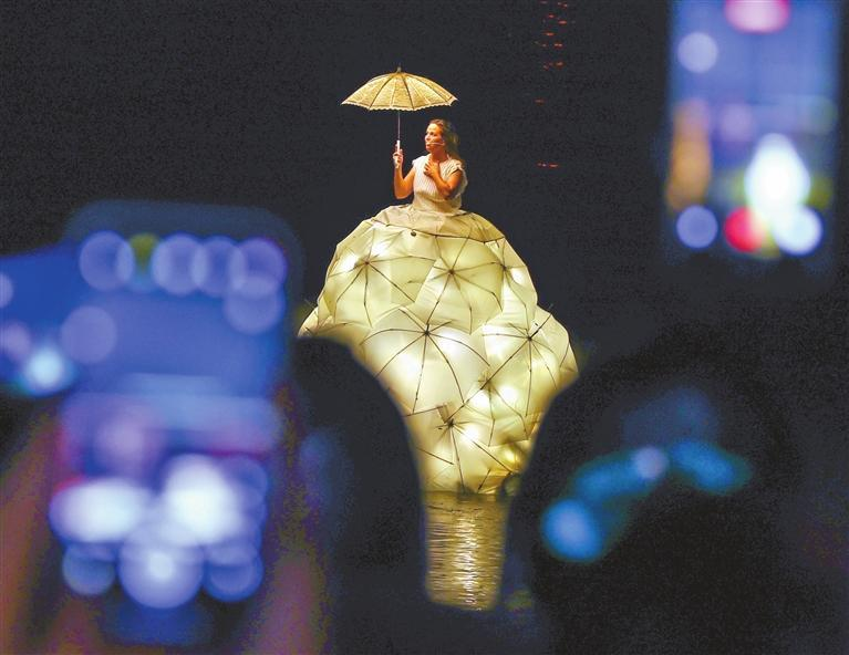 Com um vestido enorme feito de guarda-chuvas e flutuando majestosamente sobre a água, uma soprano holandesa canta músicas clássicas chinesas para espectadores durante uma performance de “A diva flutuante” no complexo K11 ECOAST de cultura e varejo no Distrito de Nanshan. A curta peça musical teatral teve sua estreia em Shenzhen de 6 a 8 de outubro. "A Diva Flutuante" é um espetáculo que foi concebido pela artista holandesa Victorine Pasman para um local específico, foi aclamado como um tesouro nacional na Holanda. Inspirada no figurino da corte europeia do século XVII e nas paisagens aquáticas holandesas, a obra combina drama, música e dramaturgia aquática.