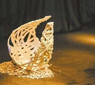 Uma das obras em destaque é um recipiente de cobre entrelaçado, intitulado “Oráculo Aquático”. Quando electrificado em água do mar, o recipiente promove o crescimento natural de cristais na sua superfície — um híbrido entre a tecelagem ancestral e a acreção marinha, que esbate a fronteira entre o natural e o artificial.
