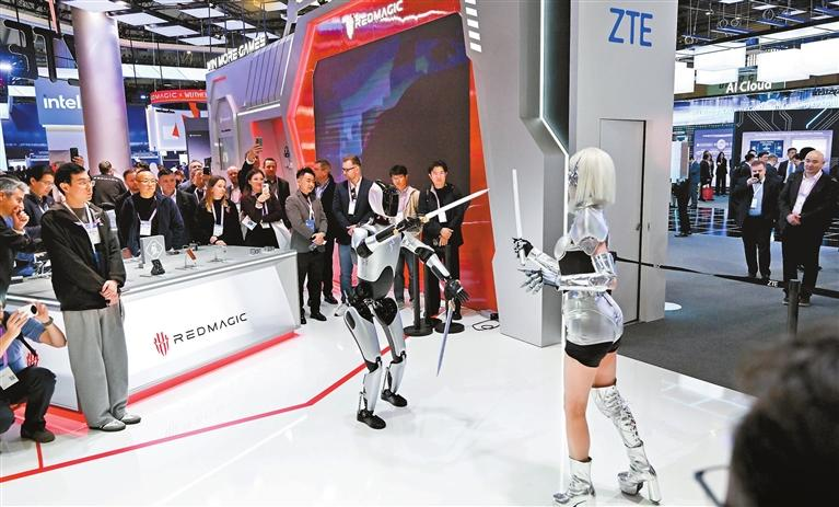 Pessoas observam um robô e um humano “duelarem” no estande da ZTE durante o Congresso Mundial de Telefonia Móvel (MWC) 2026, em Barcelona, Espanha, na segunda-feira. Xinhua