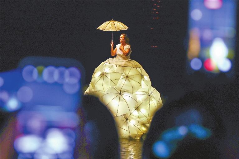 Com um vestido enorme feito de guarda-chuvas e flutuando majestosamente sobre a água, uma soprano holandesa canta músicas clássicas chinesas para espectadores durante uma performance de “A diva flutuante” no complexo K11 ECOAST de cultura e varejo no Distrito de Nanshan.